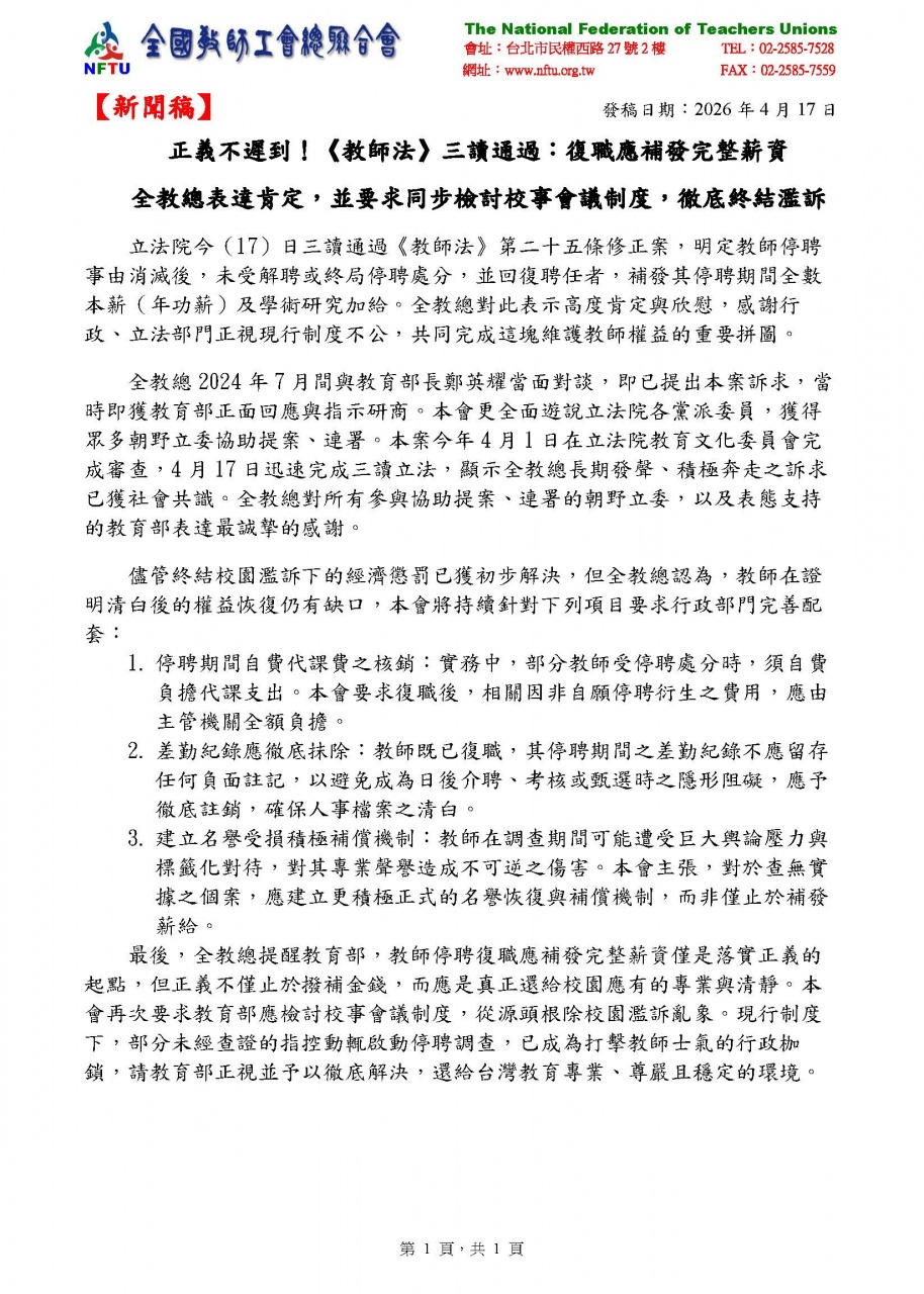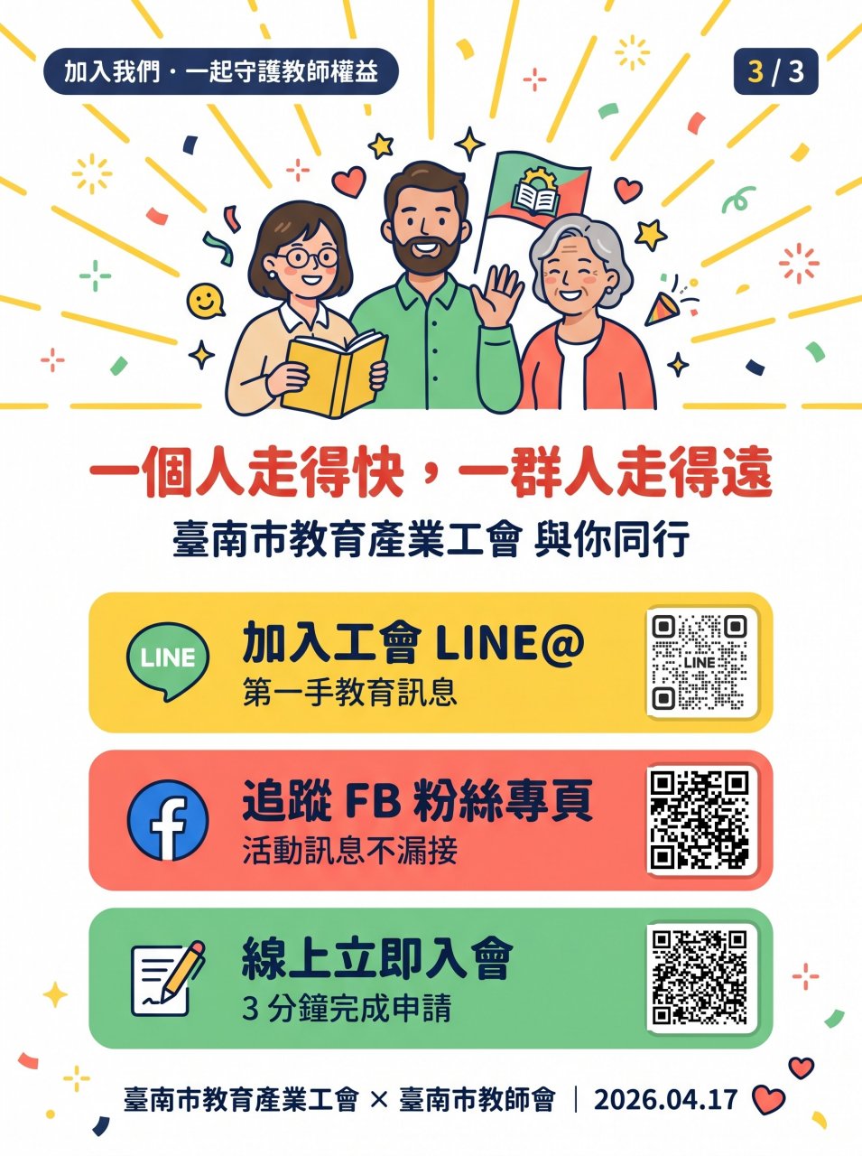 【臺南市教育產業工會/臺南市教師會】20260417訊息