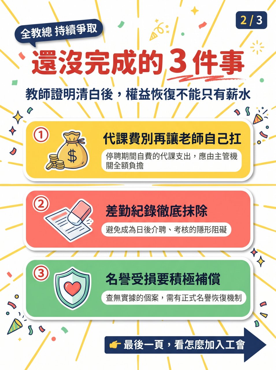 儘管終結校園濫訴下的經濟懲罰已獲初步解決,但全教總認為,教師在證明清白後的權益恢復仍有缺口,本會將持續針對下列項目要求行政部門完善配套:
